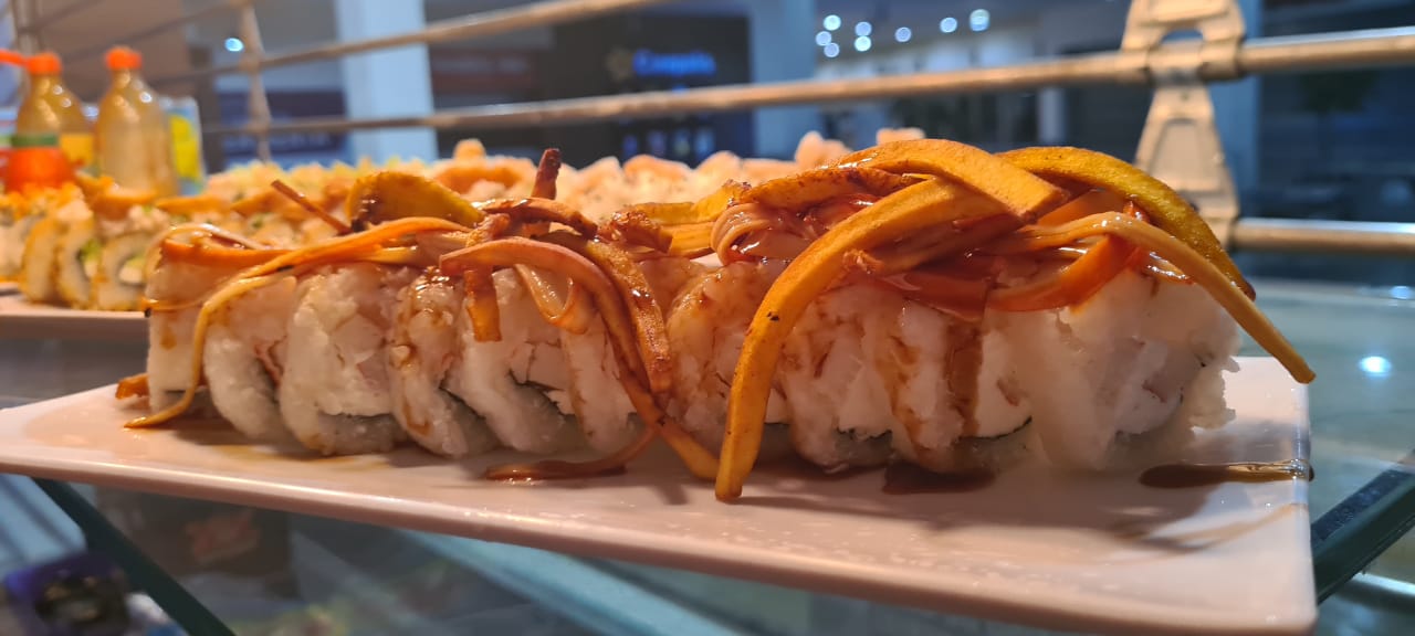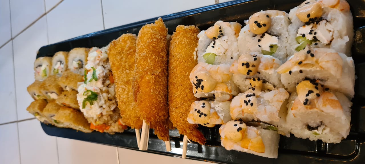 2 Rollos a elegir, 1 yakimeshi tampico, 2 kushiagues de camarón, 2 kushiagues de plátano.