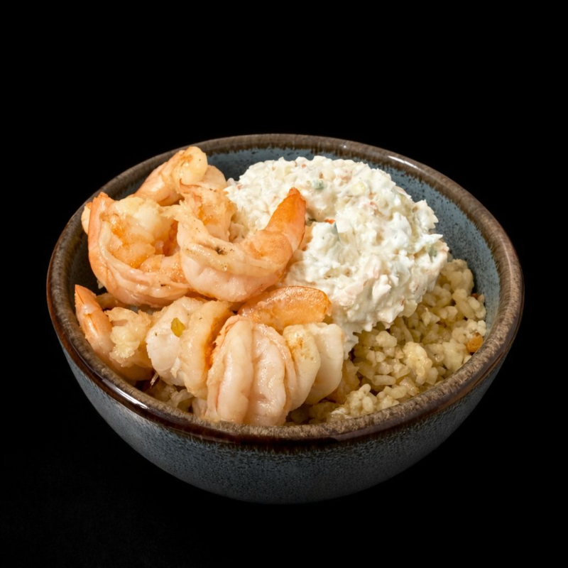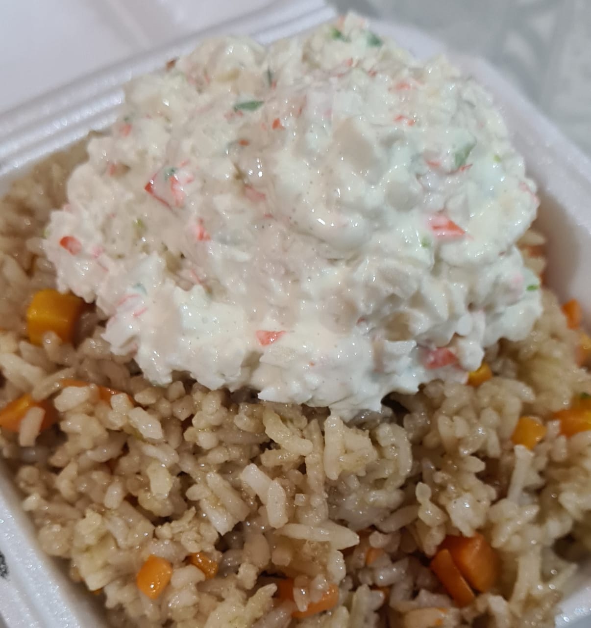 Arroz frito con verduras, salsa de soya con camarón y salsa tampico.