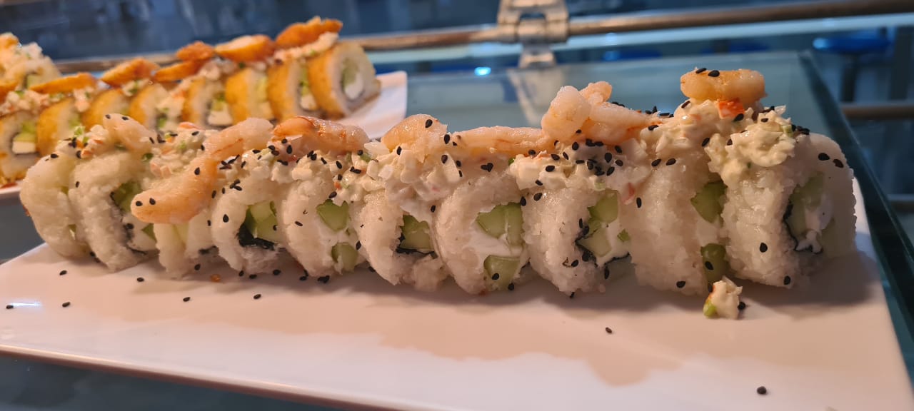 Queso crema, surimi y pepino, por fuera camarón y aderezo de chipotle.