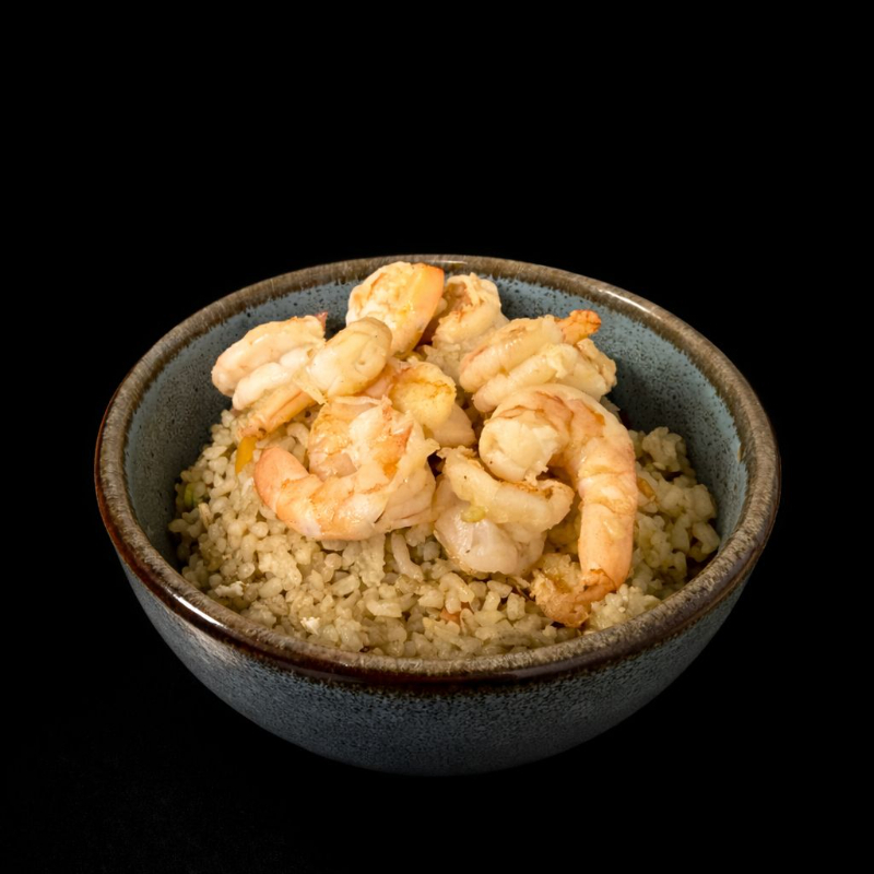 Porción de arroz frito con verduras y salsa de soya con camarón pacotilla