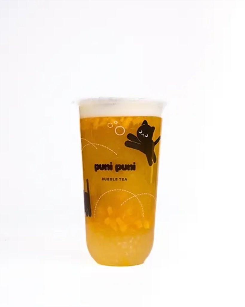 Té verde, mango, jarabe de mango, leche de coco, leche de vaca, sago, hielo, jarabe de caña, foam de vainilla