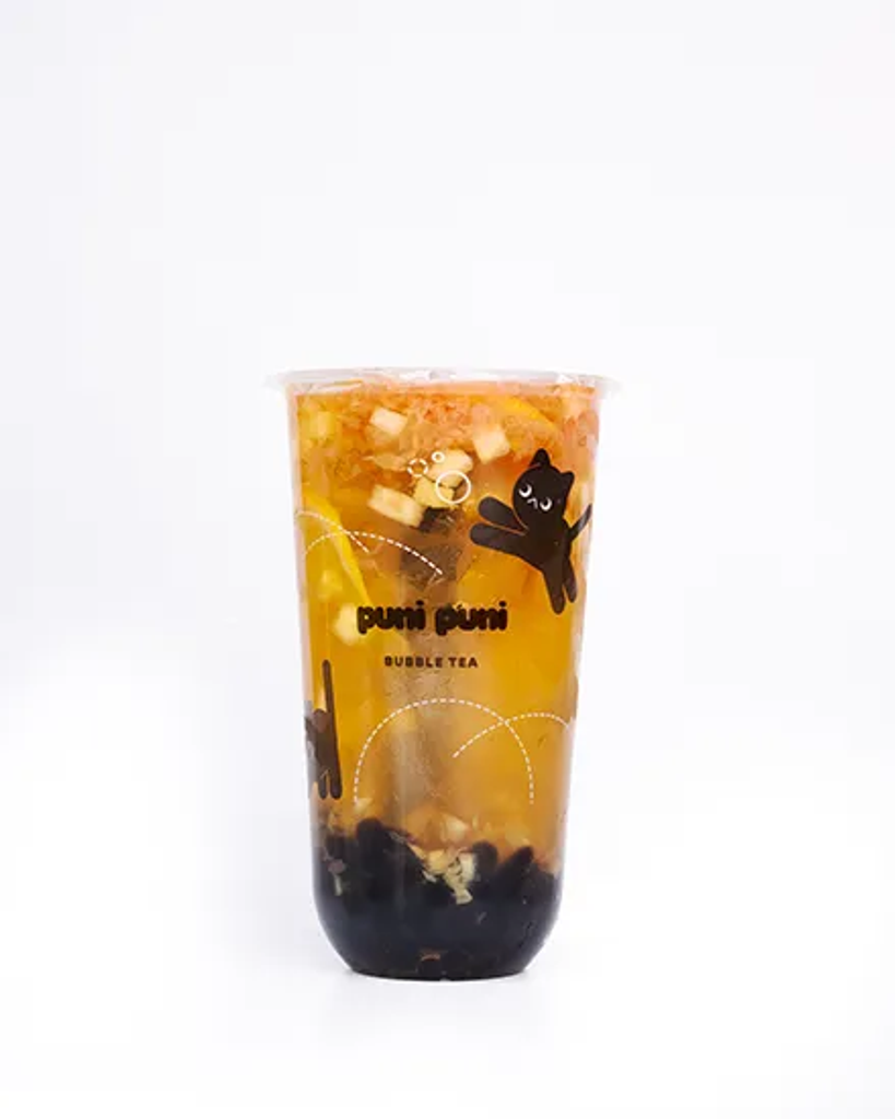 Te verde, pulpa de toronja, concentrado de toronja, rodaja de toronja, rodaja de limón eureka, boba, hielo, jarabe de caña
