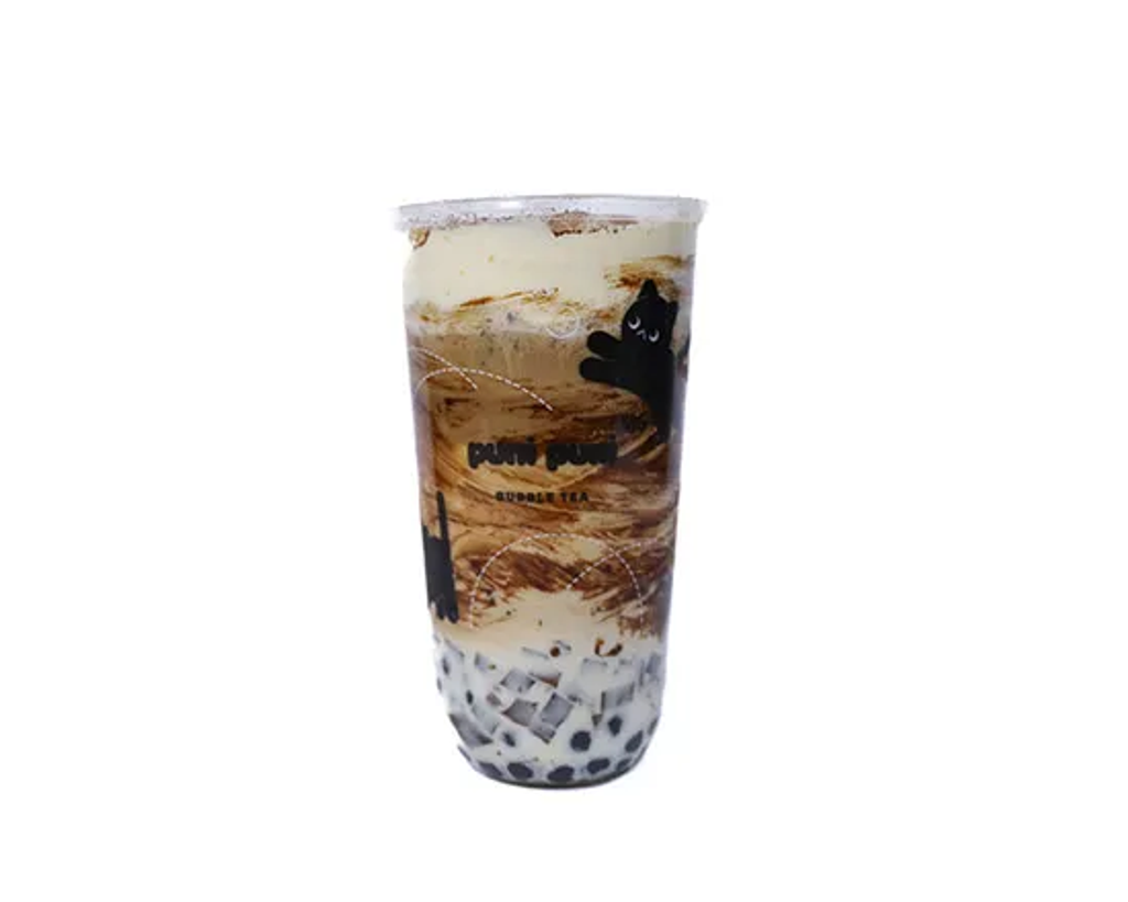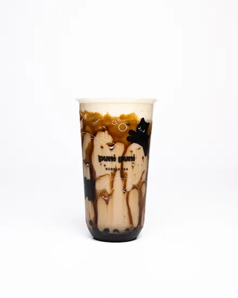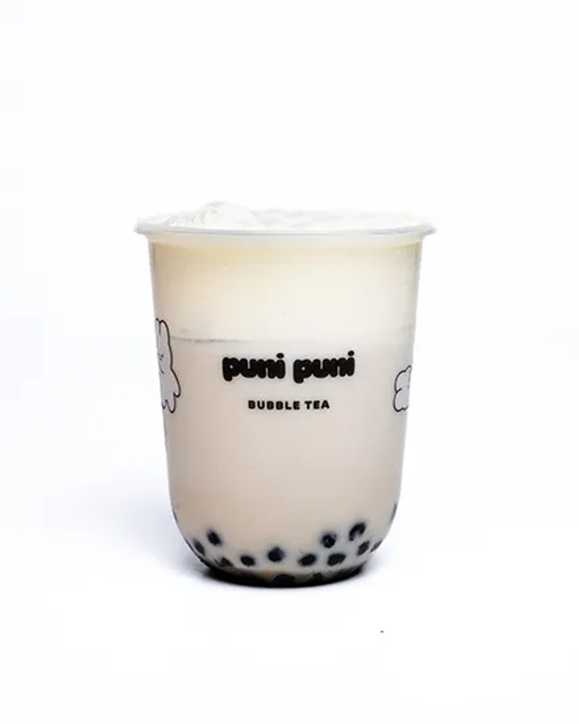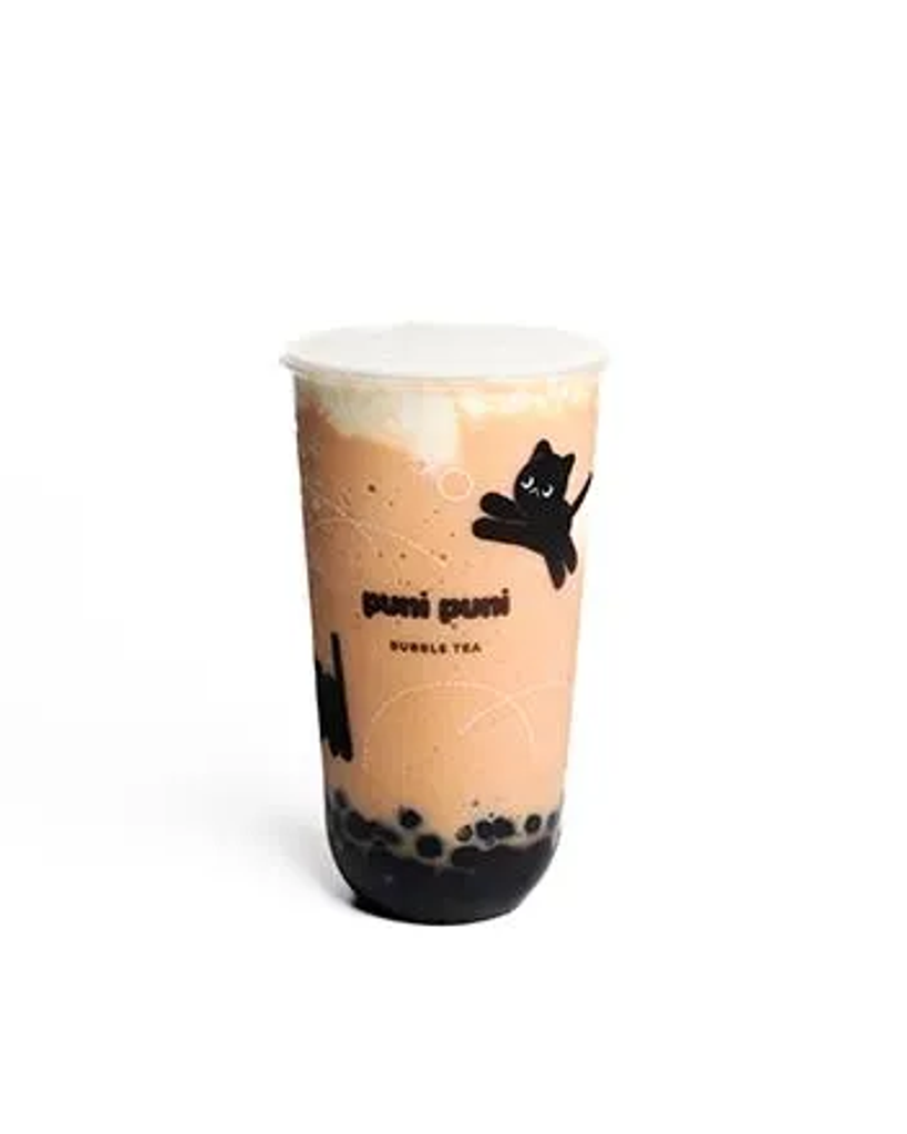 Te de assam, leche, brown sugar boba, hielo, brown sugar syrup, jarabe de caña y foam de queso