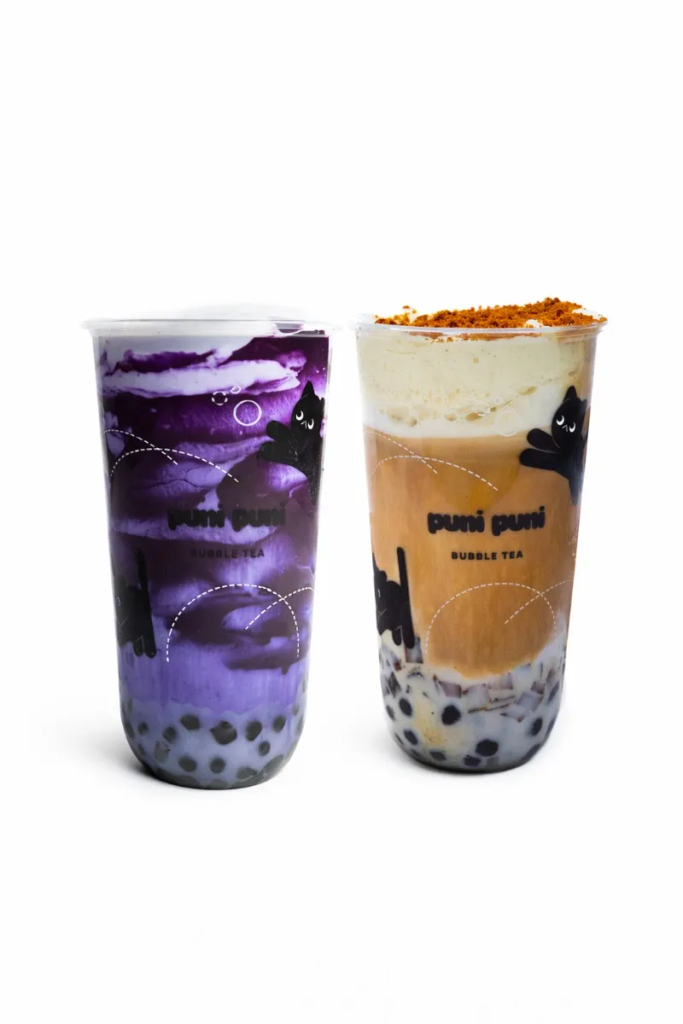 Taro en polvo, agua caliente, leche, boba, hielo, ube walling, jarabe de caña