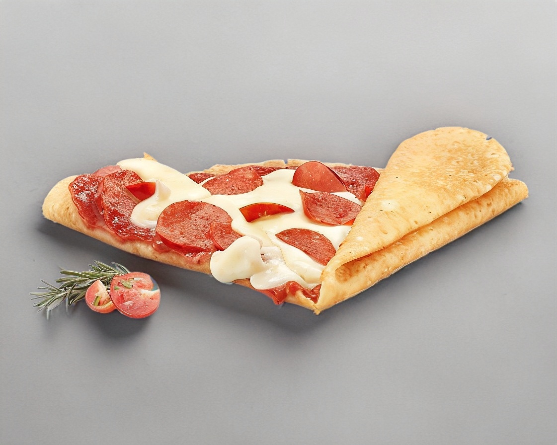 Relleno de queso manchego, salchicha de pavo sancochada y decorada con salsa para pizza artesanal y pepperoni
