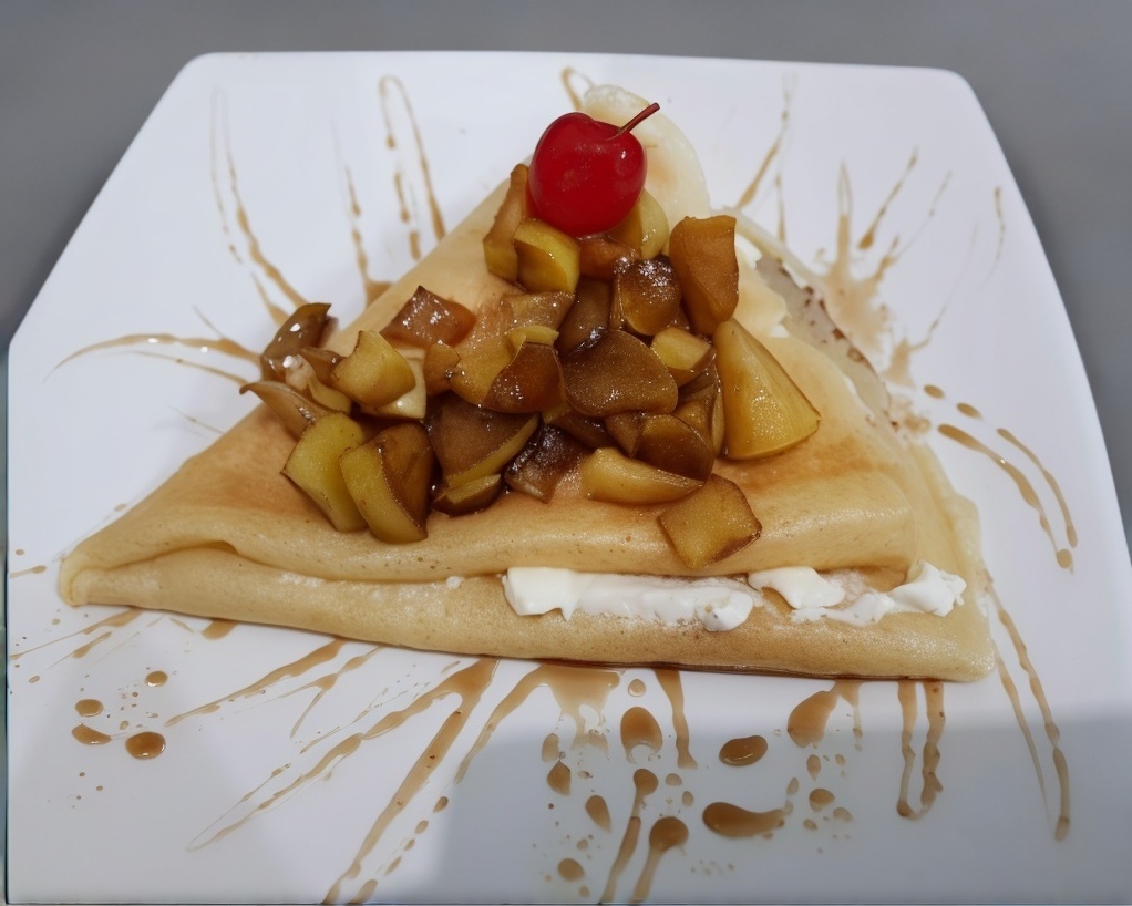 Rellena de Philadelphia, salsa de caramelo, manzanas caramelizadas con un toque de canela, cereza, todo preparado al momento para mayor frescura y sabores auténticos.