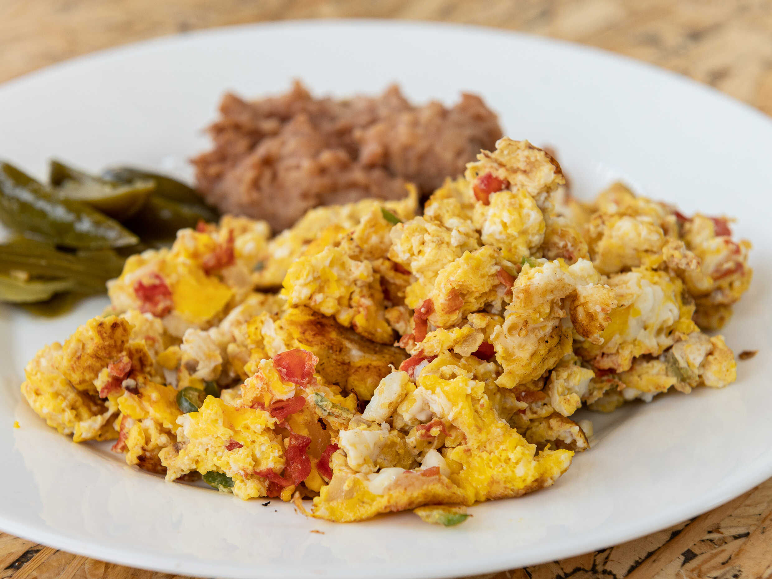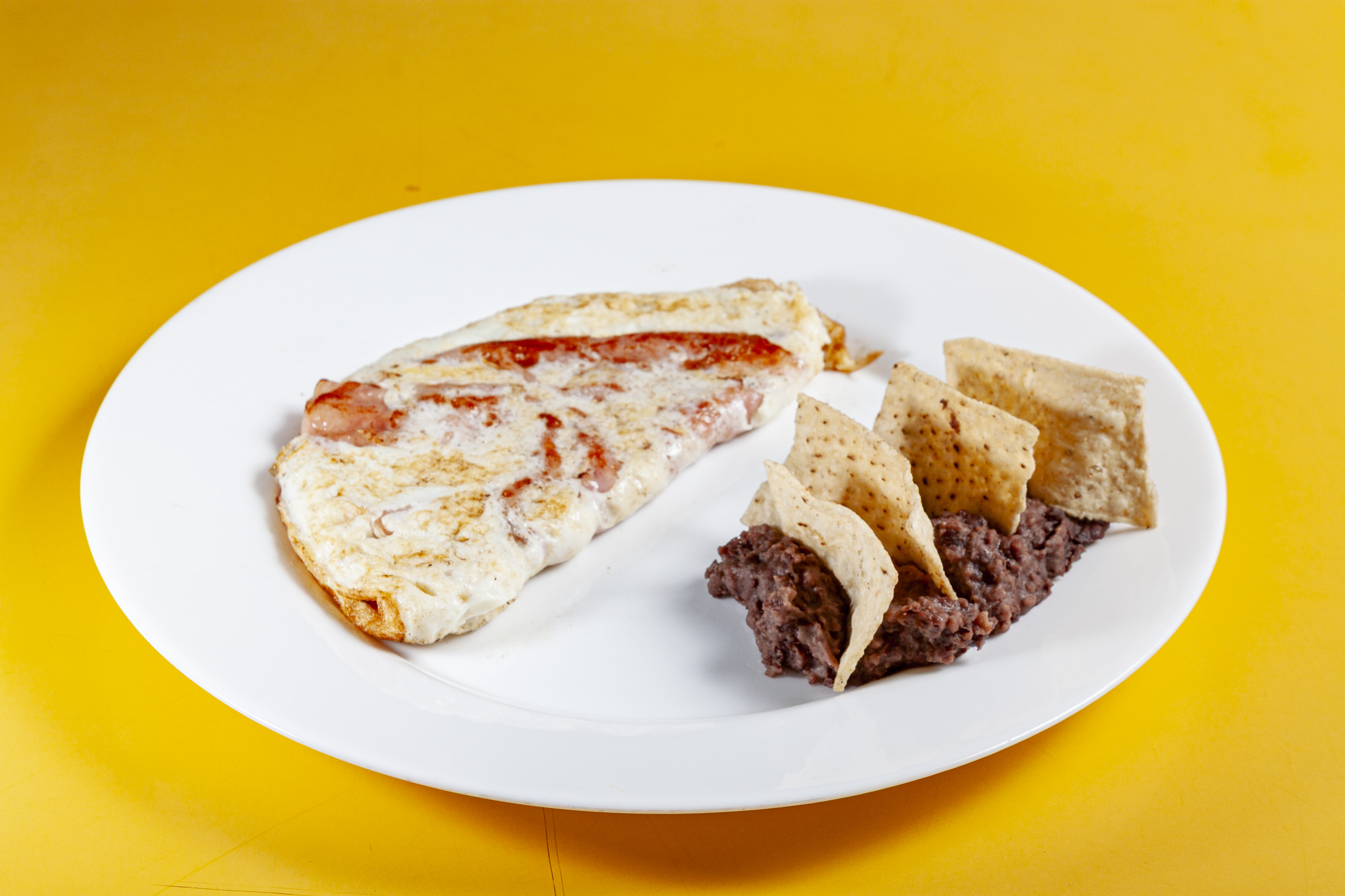 Jamón, frijoles refritos y queso manchego. Incluye café americano o té chico, jugo o fruta.