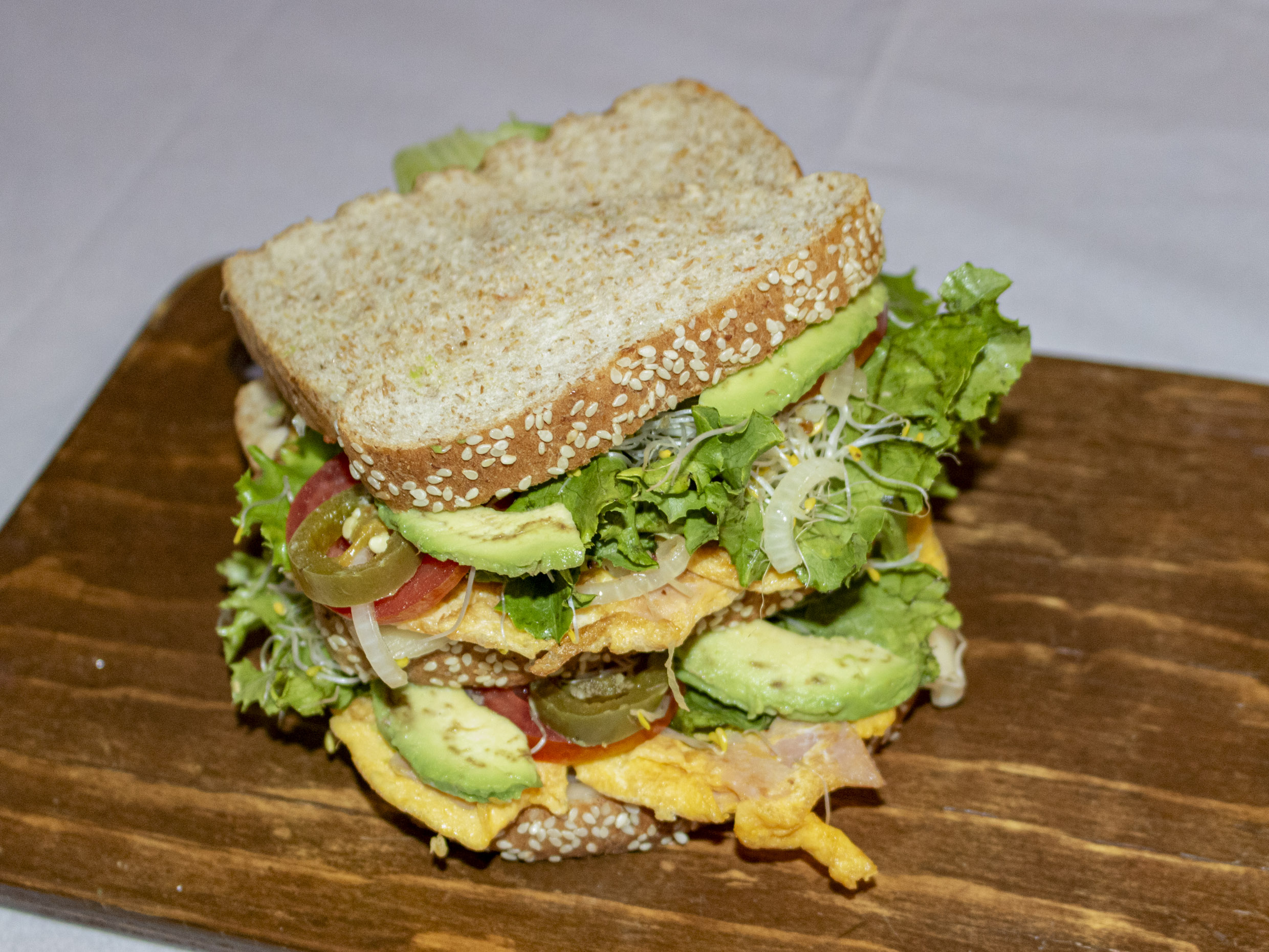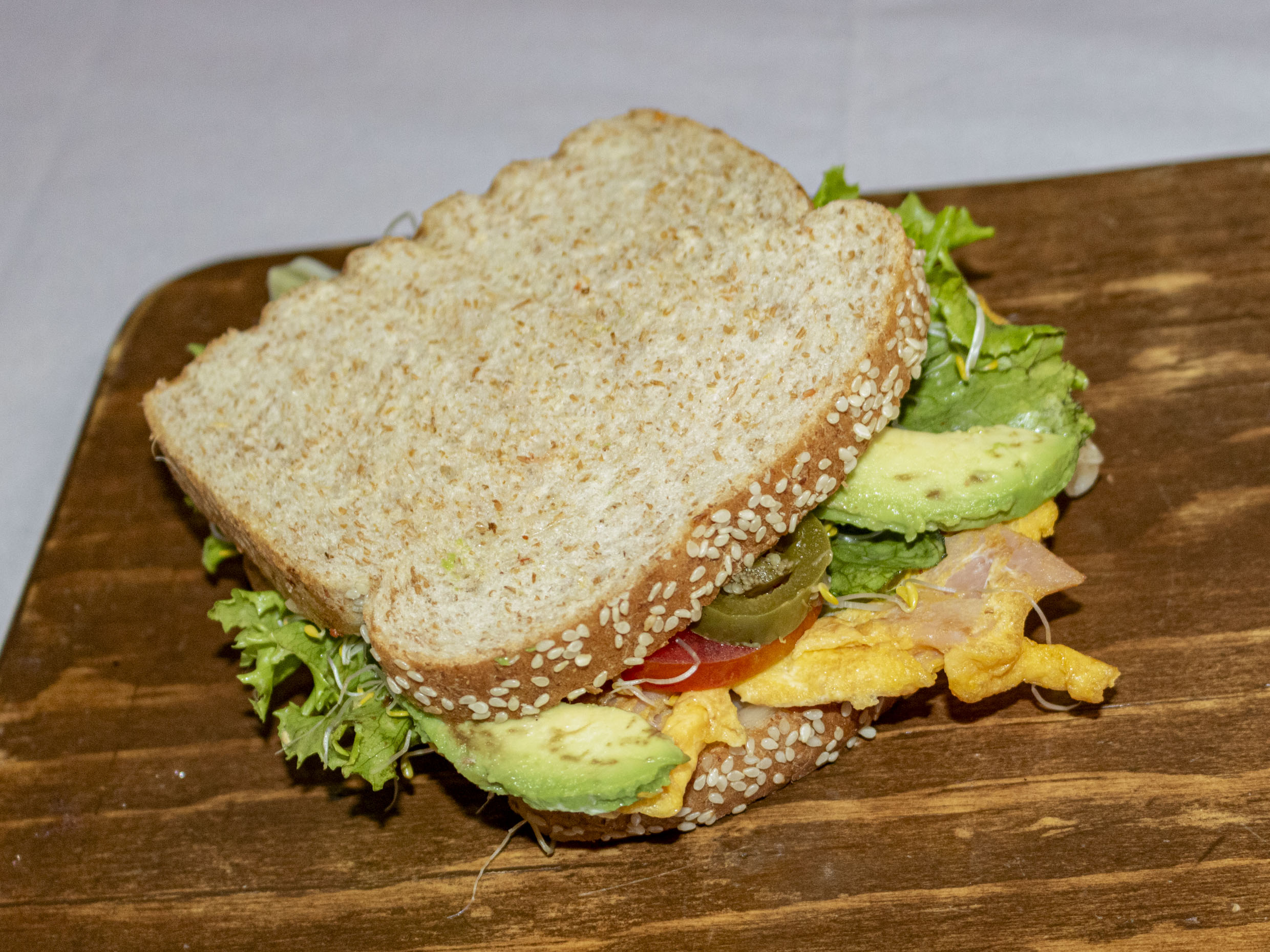 Huevo, jamón, queso, lechuga, germen de alfalfa, jitomate, cebolla, aguacate, mayonesa o aderezo.