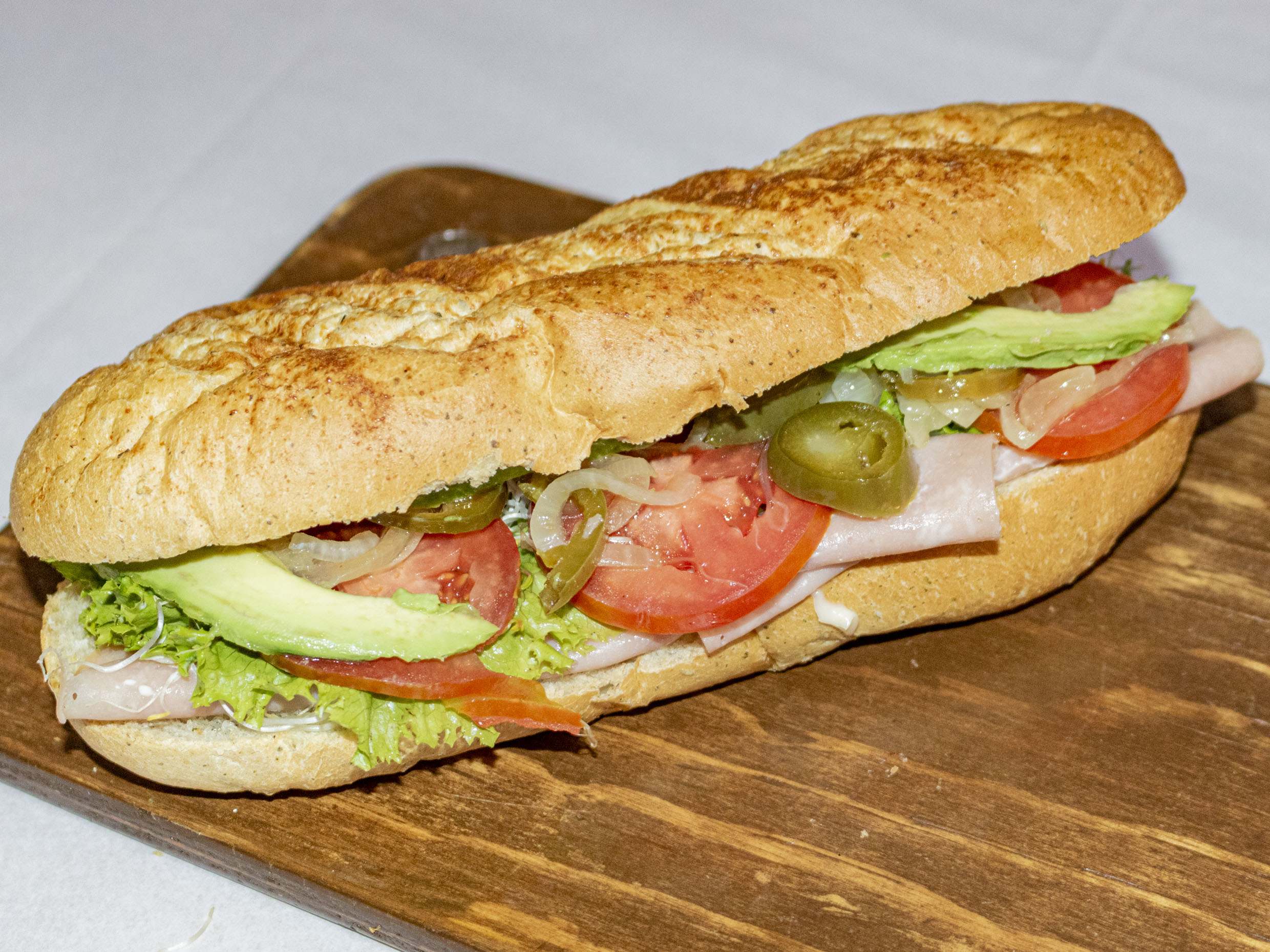 Baguette 20 cm artesanal, jamón, queso, lechuga, germen de alfalfa, jitomate, cebolla, aguacate, mayonesa o aderezo