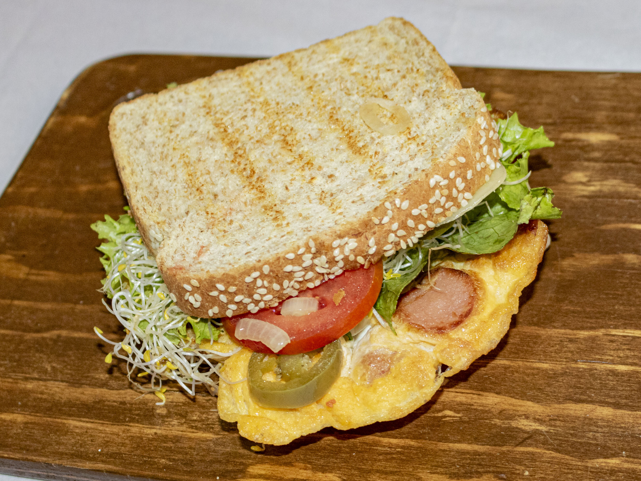 Huevo con Salchicha, Queso, Lechuga, Germen de alfalfa, Jitomate, Cebolla, Chiles, Aguacate, Mayonesa o Aderezo