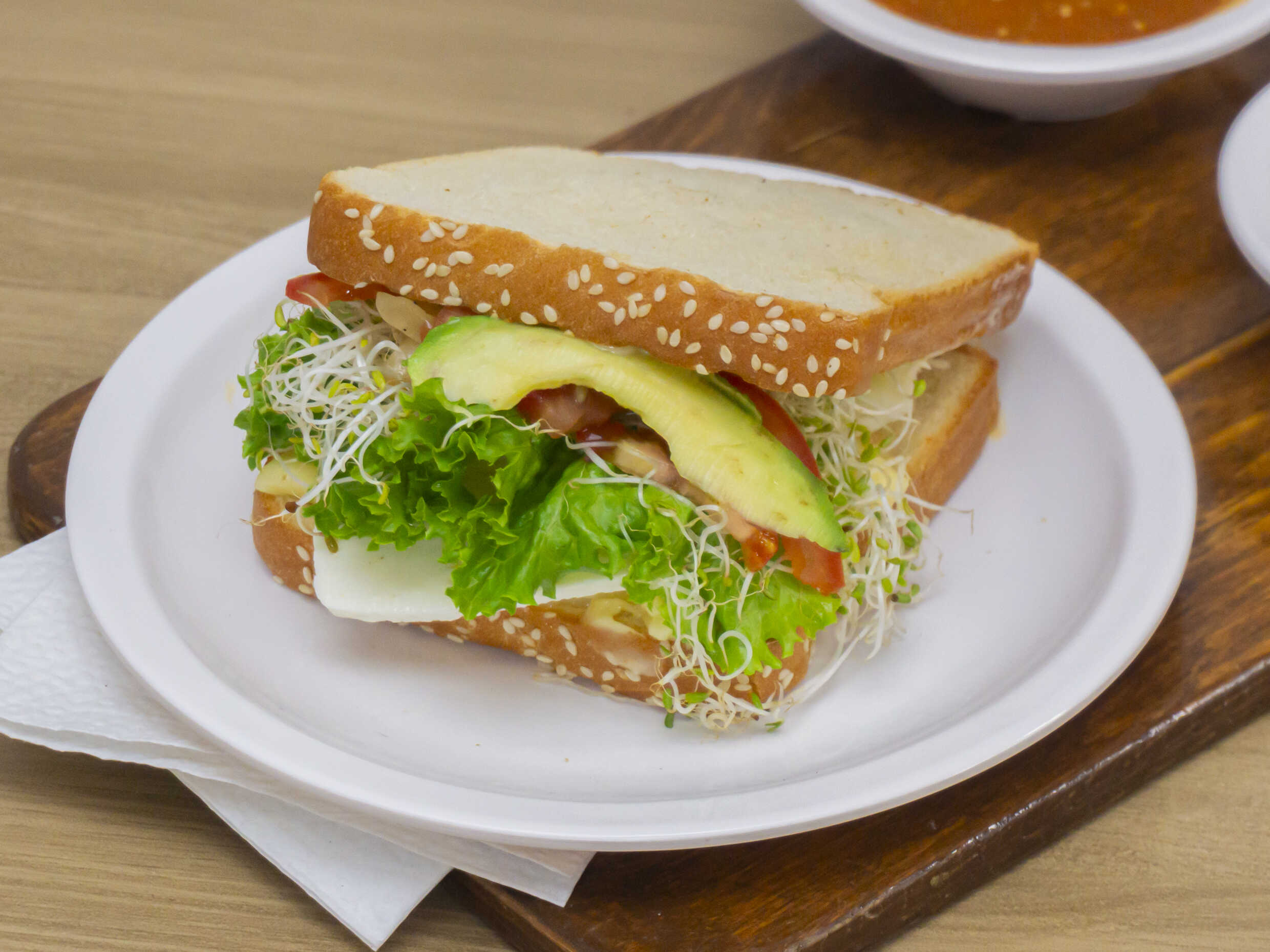 Jamón, queso, lechuga, germen de alfalfa, jitomate, cebolla, aguacate, mayonesa o aderezo.