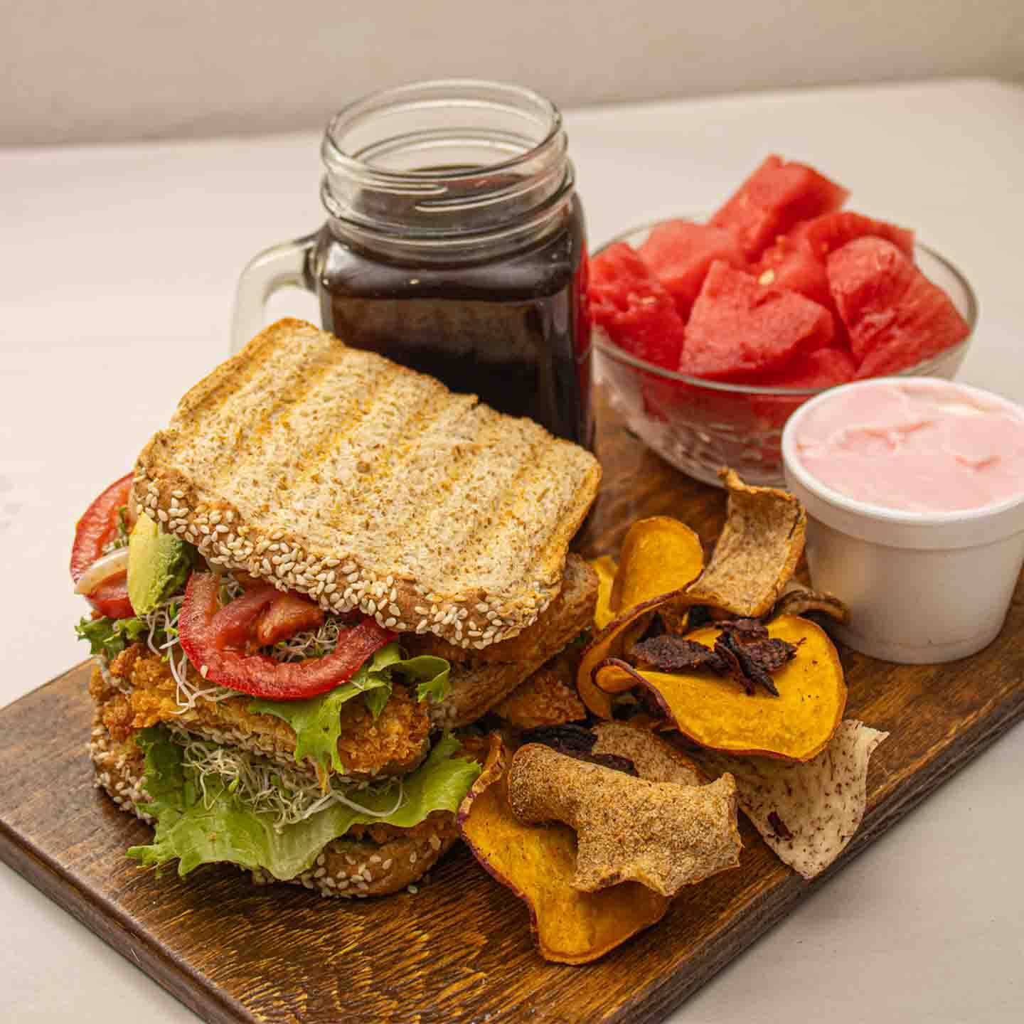 Pechuga de pollo empanizada, queso, lechuga, germen de alfalfa, jitomate, cebolla, aguacate, mayonesa o aderezo.