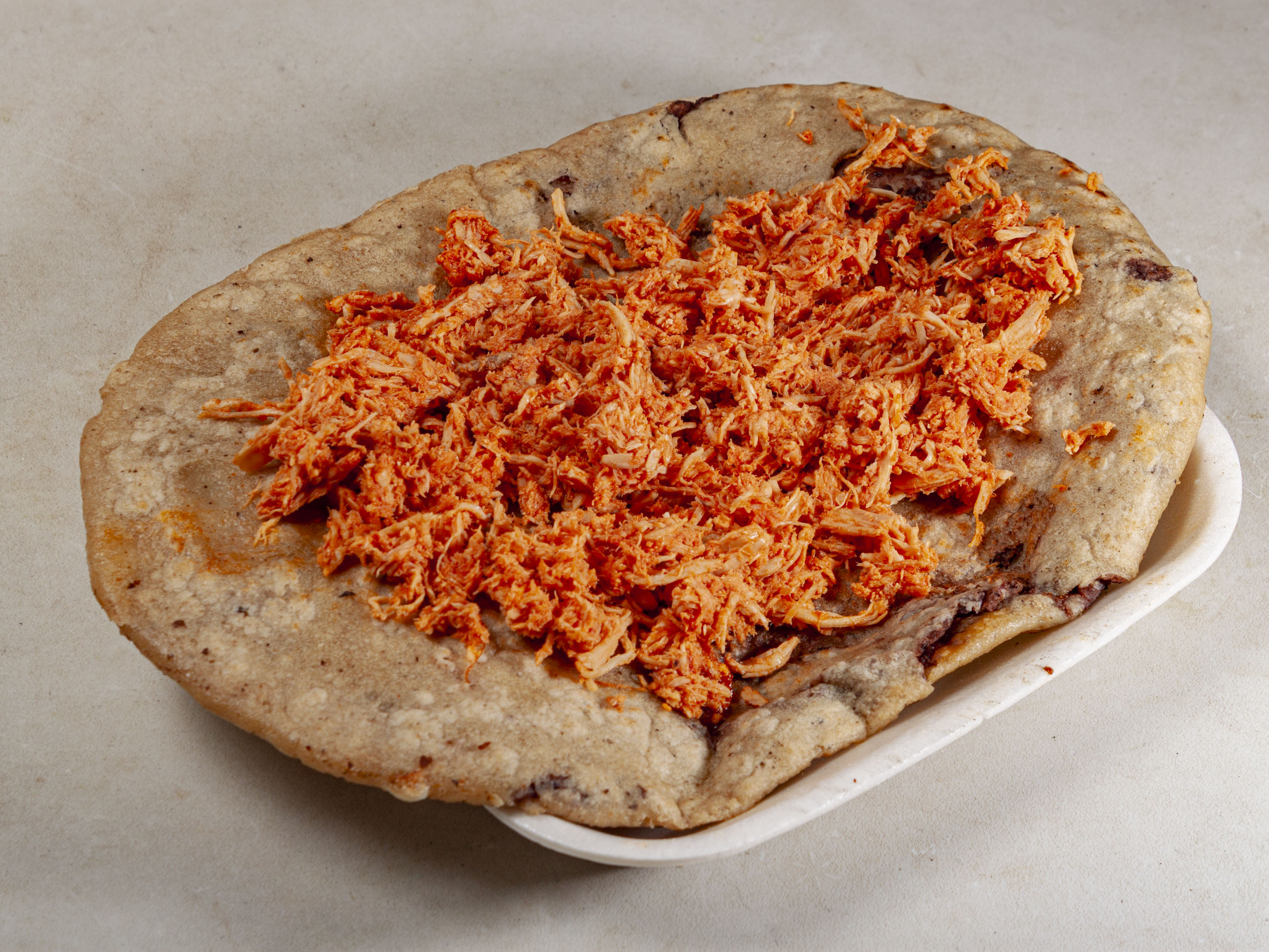 huarache con pollo guisado con jitomate.