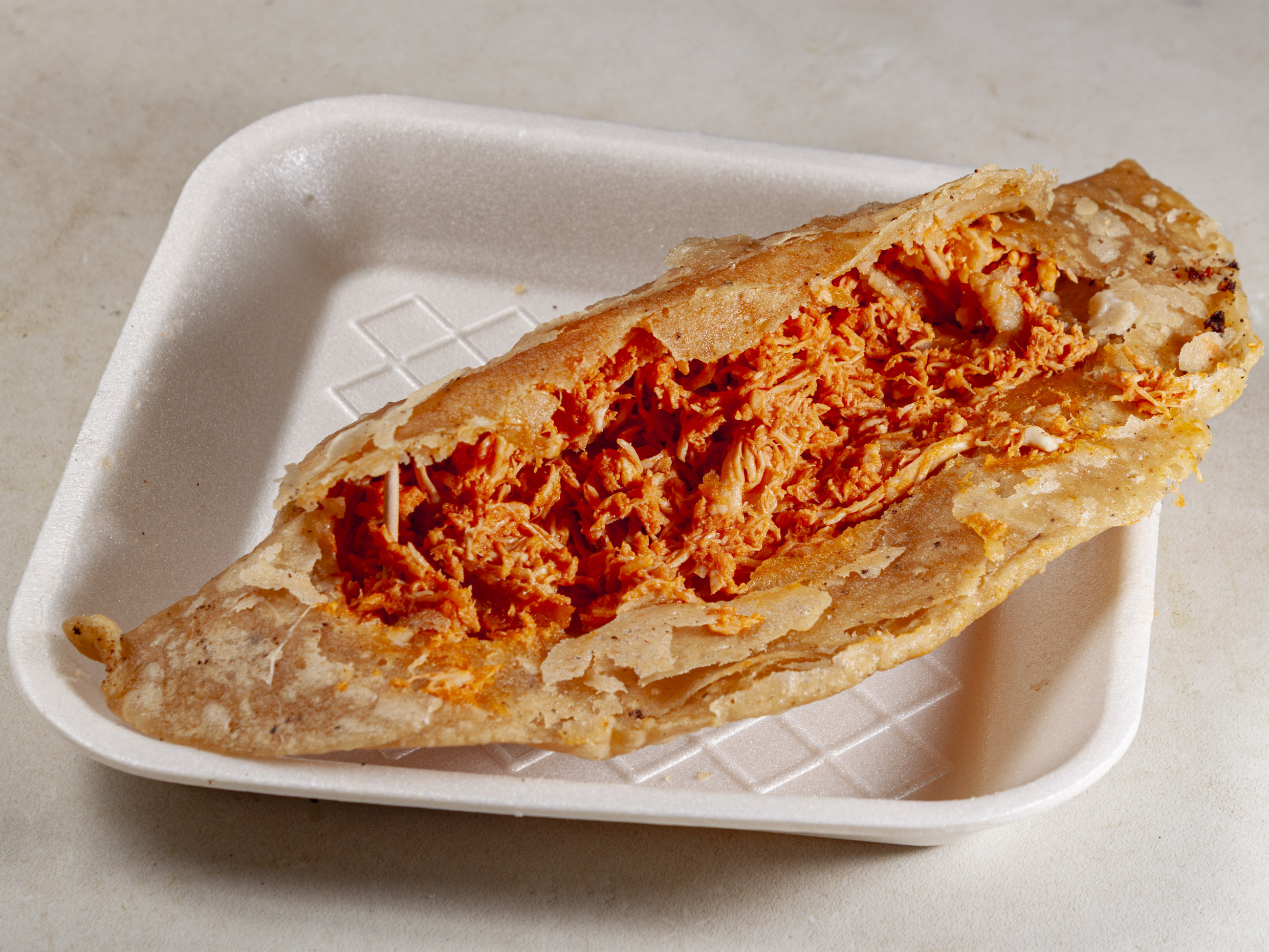 Quesadilla de Pollo (1 pieza). Tortilla rellena de tinga de pollo (pollo deshebrado guisado).