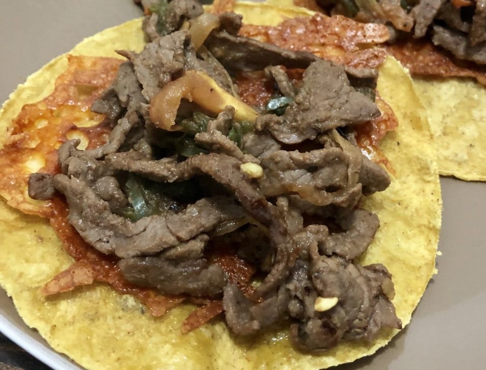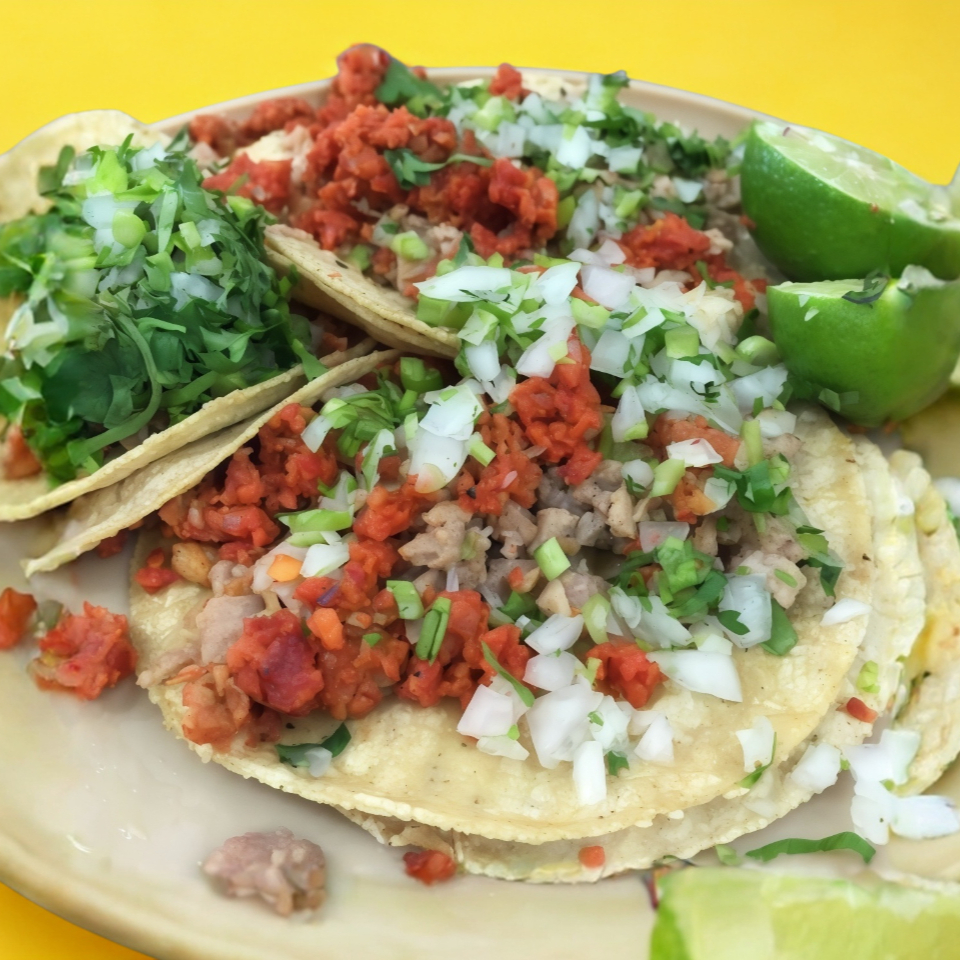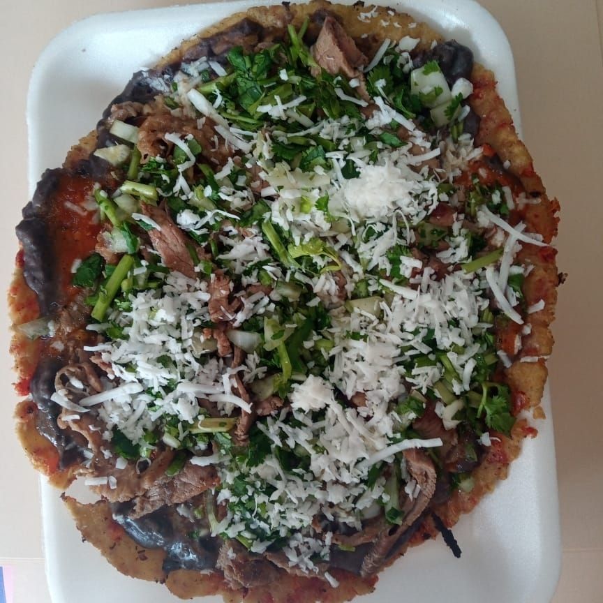 Tortilla de masa hecha a mano extra grande primer capa de salsa, seguido de bistec y longaniza, cebolla y queso rallado.