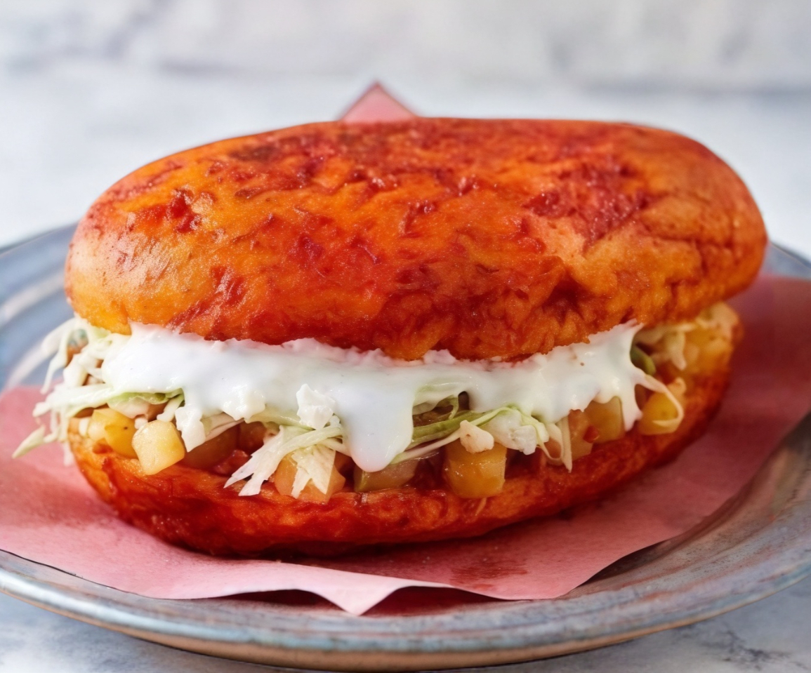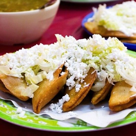 QUESADILLA FRITA CON RELLENO DE TINGA DE RES A LA MEXICANA , QUESO CREMA Y LECHUGA