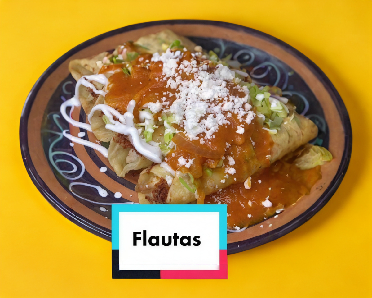 Orden de 3 flautas de carne bañadas en salsa roja de papa, carne y suadero