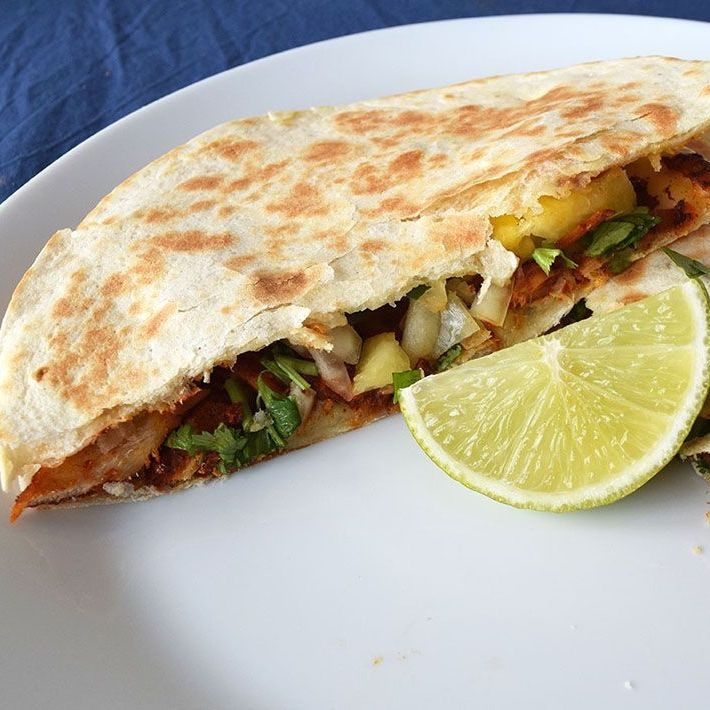 QUESADILLA RELLENA DE CHICHARRON PRENSADO , CREMA QUESO RALLADO Y LECHUGA