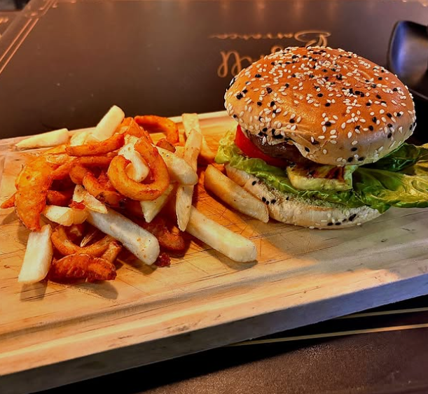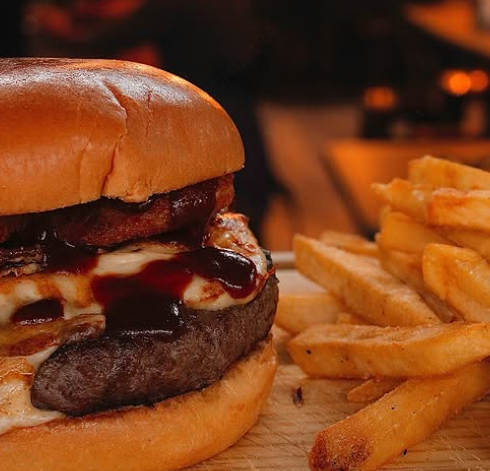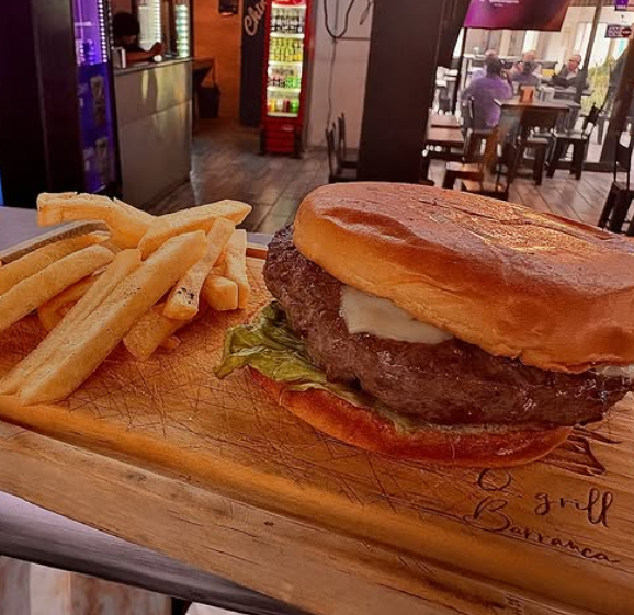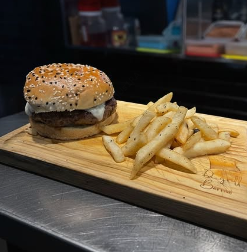 300 g De rib eye, tocino, salsa bbq, queso suizo y bollo brioche. Incluye porción de papas a la francesa.