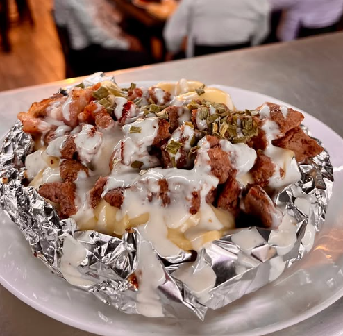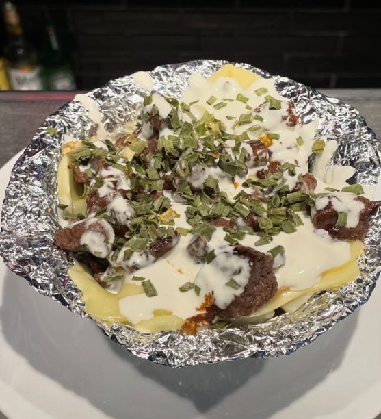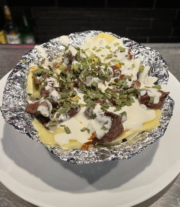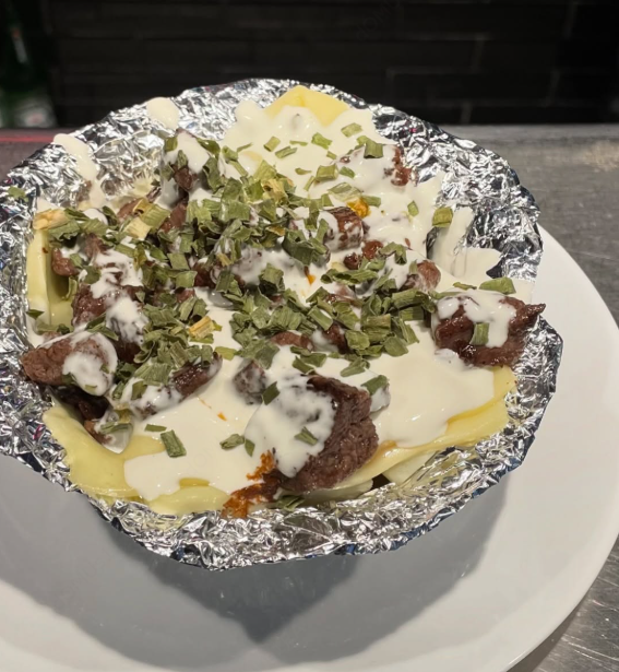 100 g De picanha, crema, tocino, queso suizo y cebollín deshidratado.