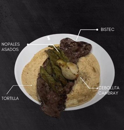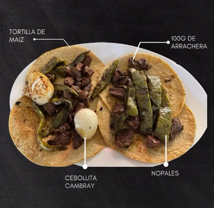 100 g De bistec, nopalitos, cebolla cambray y aguacate.
