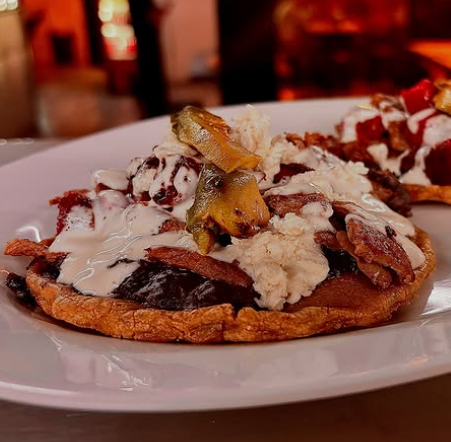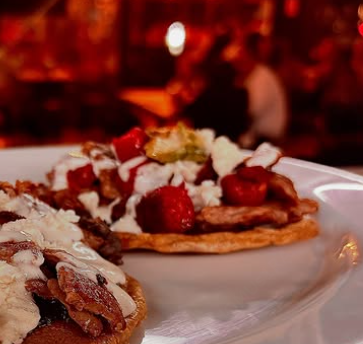 100 g De bistec, frijoles, chorizo, queso panela, crema y aguacate.