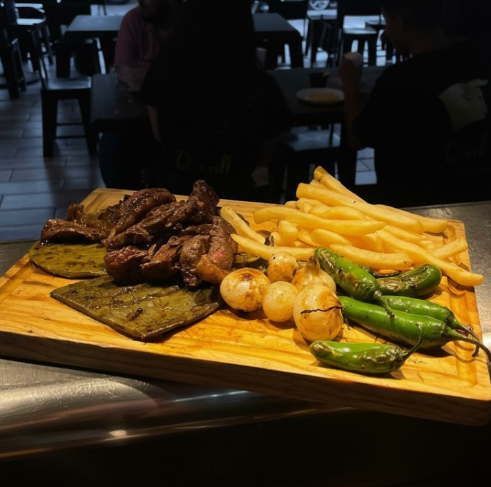 200 g De arrachera, chistorra, frijoles, jitomate, cebolla.