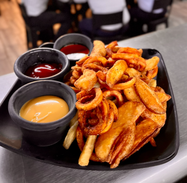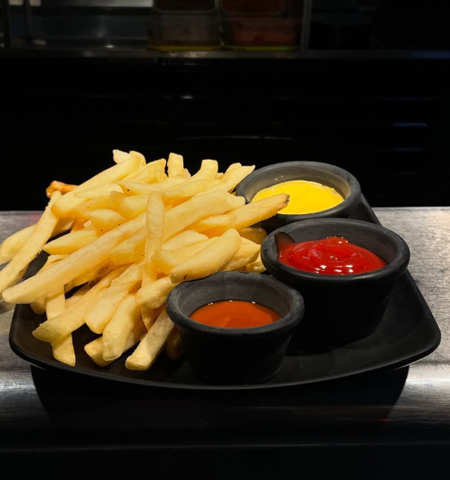 300 g De papas a la francesa acompañadas de queso, cátsup y salsa.