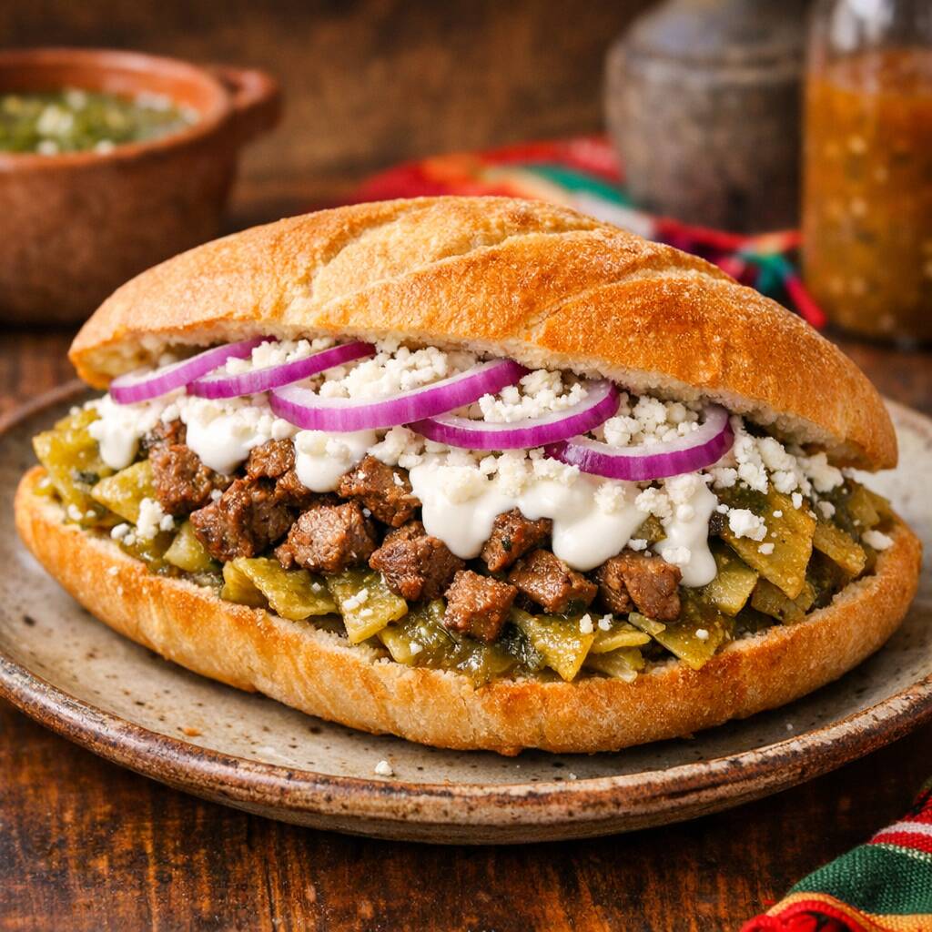 Sabrosa torta de Chilaquiles con bistec picado, queso, crema, cebolla morada y frijoles refritos.