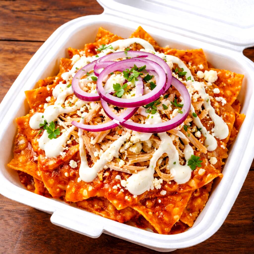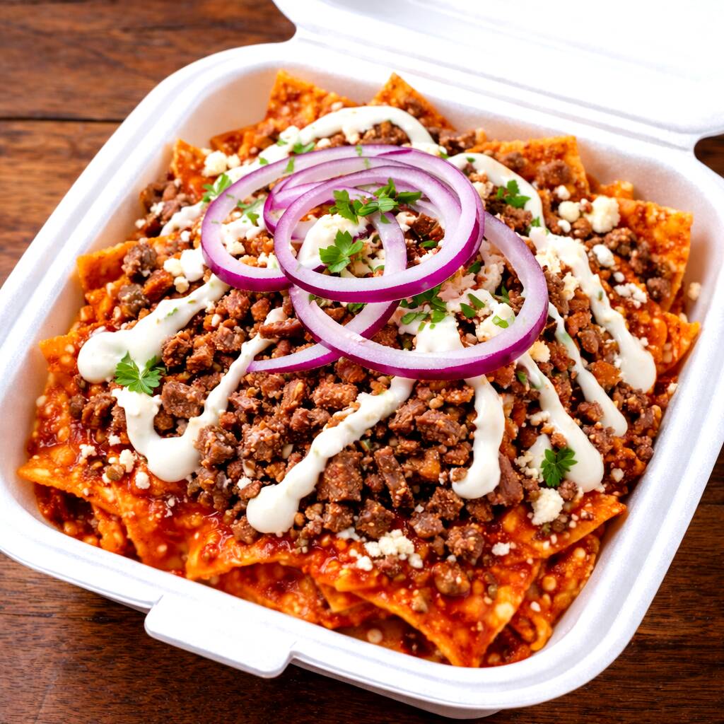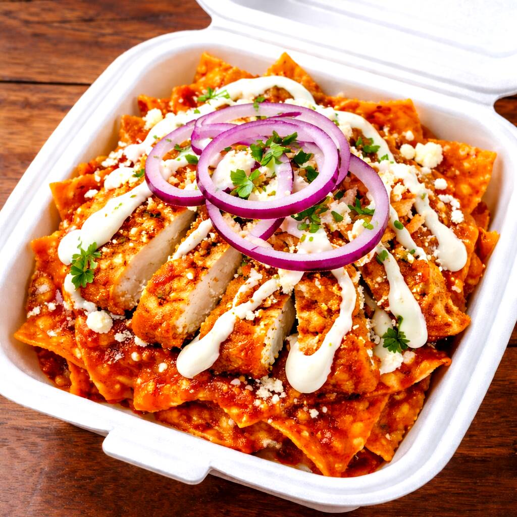 SABROSOS CHILAQUILES EN SALSA MORITA, CON MILANESA, QUESO RALLADO, CREMA, CEBOLLA MORADA, BOLILLO Y TENEDOR.
