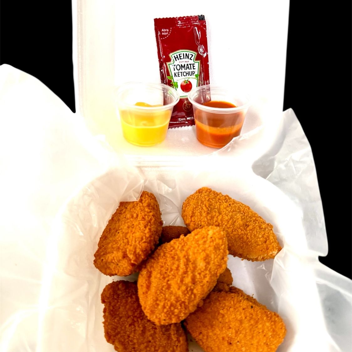 Deliciosos Nuggets 6 pzas con queso, catsut y valentina. Preparalos a tu gusto