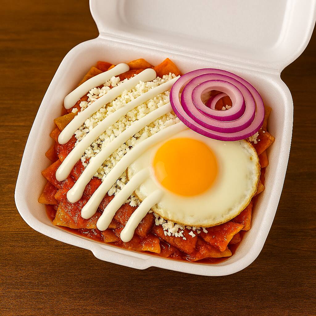 CHILAQUILES EN SALSA MORITA, HUEVO ESTRELLADO, QUESO RALLADO,CREMA, CEBOLLA MORADA, BOLILLO Y TENEDOR
