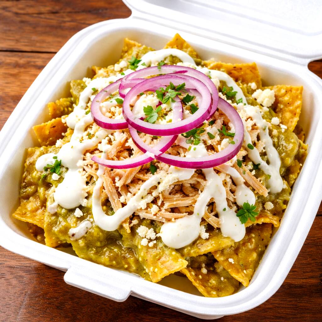 SABROSOS Y NUTRITIVOS CHILAQUILES VERDES, CON PECHUGA DE POLLO, QUESO RALLADO,CREMA, CEBOLLA MORADA, BOLILLO Y TENEDOR