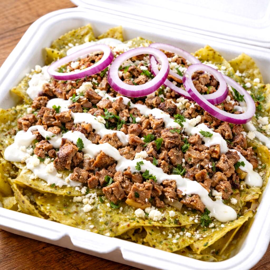DELICIOSOS CHILAQUILES VERDES, CON BISTEC, QUESO RALLADO, CREMA, CEBOLLA MORADA, BOLILLO Y TENEDOR.