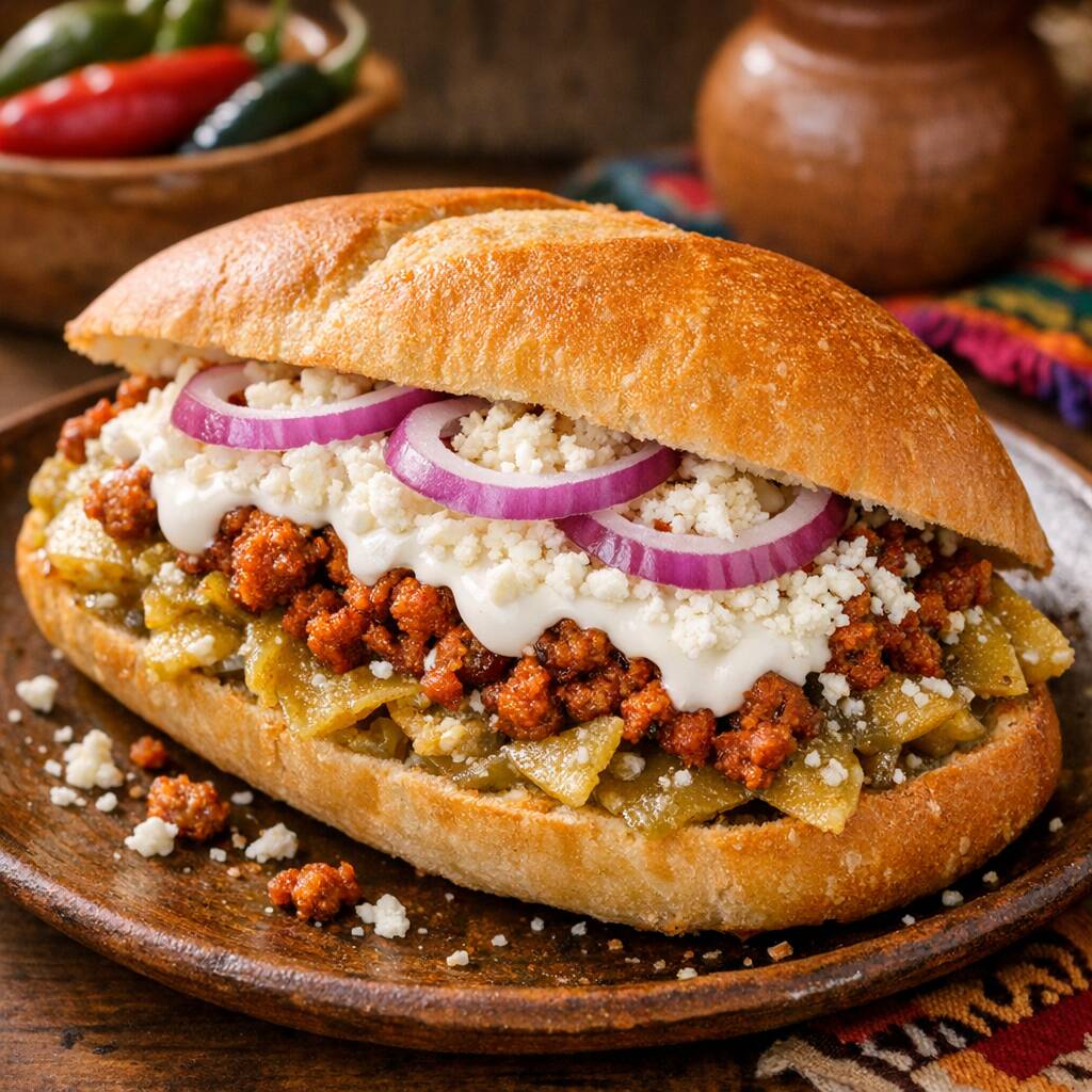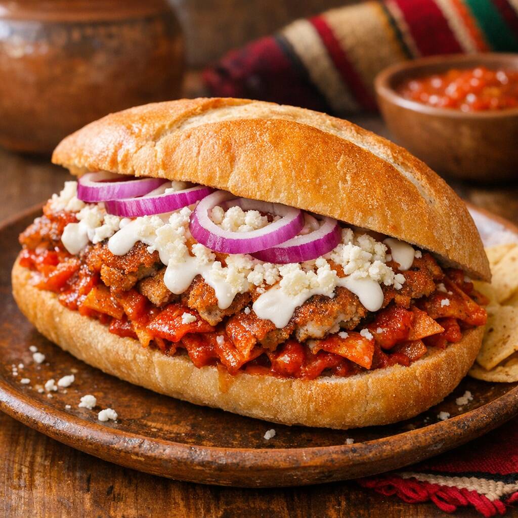 Deliciosa Torta de Chilaquiles con Chorizo, queso, crema, cebolla y frijoles refritos.