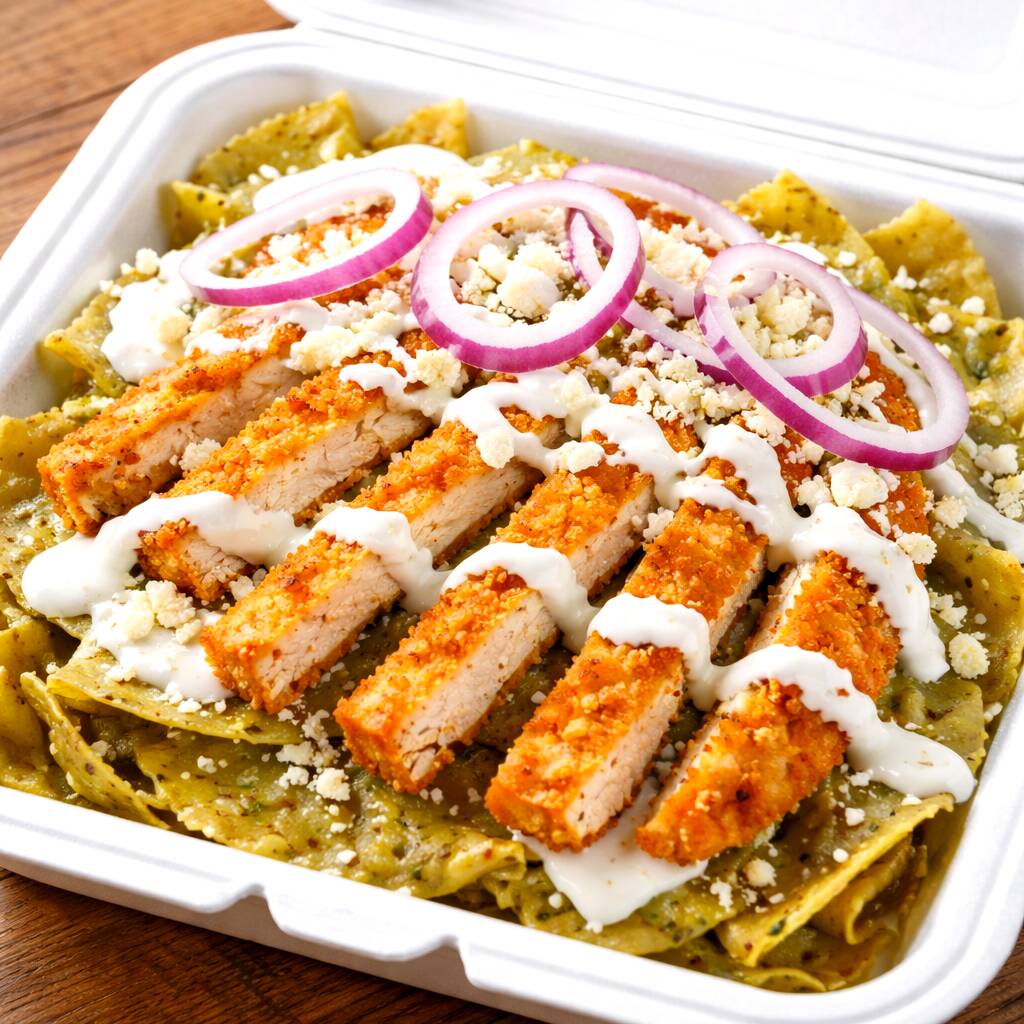 SABROSOS CHILAQUILES VERDES CIN MILANESA, QUESO RALLADO, CREMA, CEBOLLA MORADA, BOLILLO Y TENEDOR.
