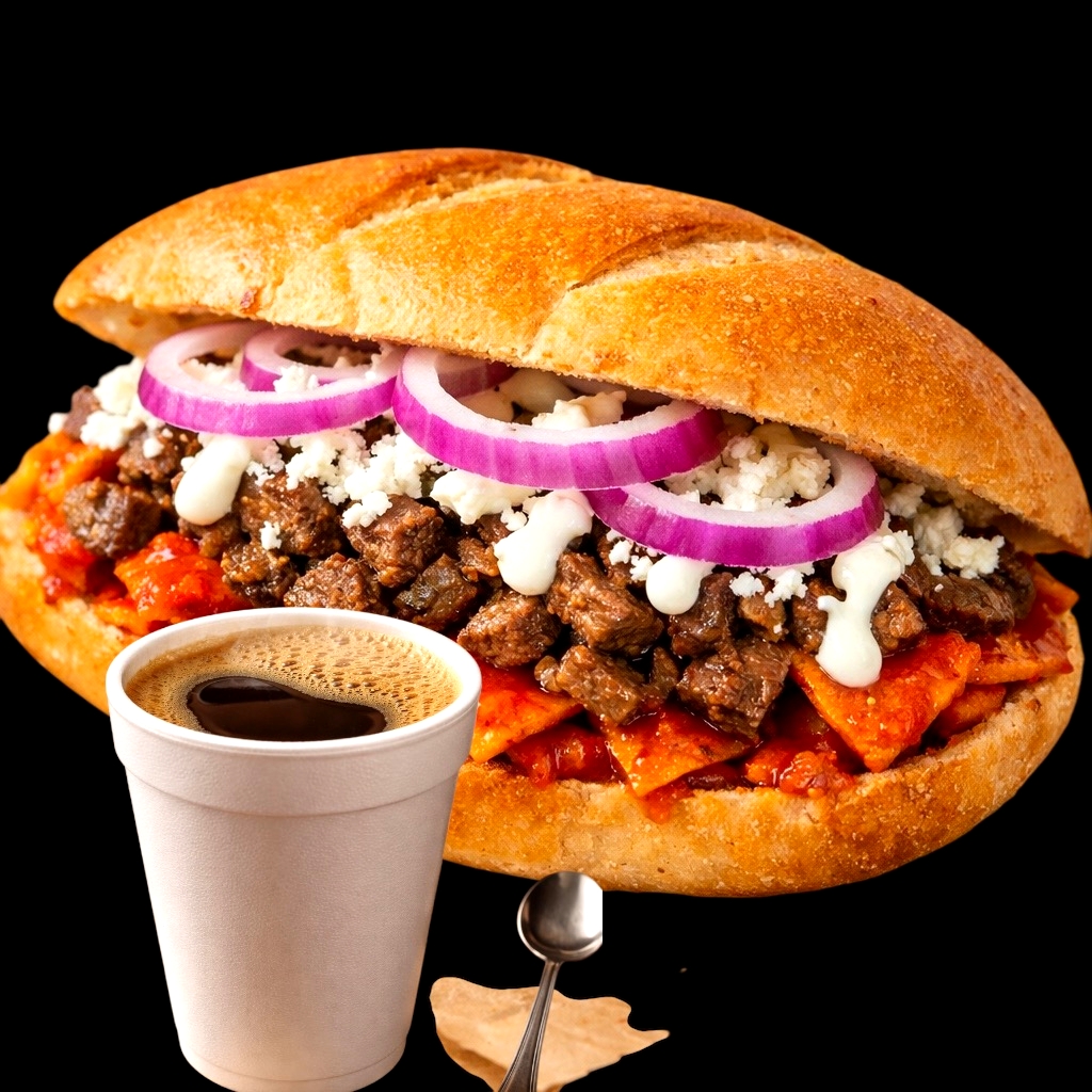 Café de Olla*1 + Torta de Chilaquiles con Bistec*1