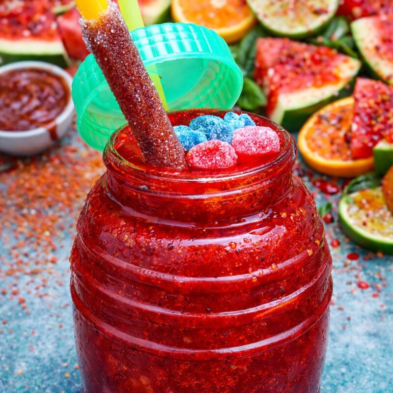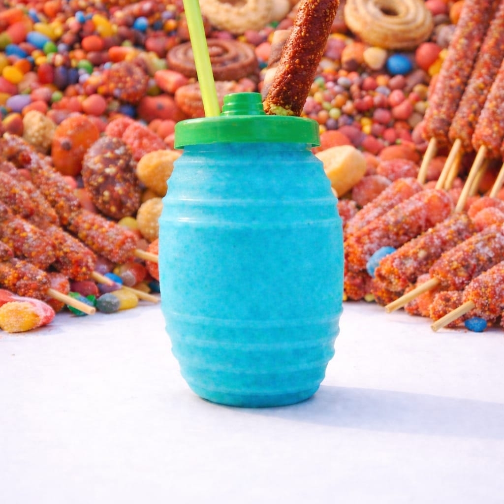 Escarchado completamente por dentro del vitrolero sabor picafresa, jarabe sabor limón, banderilla de tamarindo, chamoy, miguelito y gomitas .