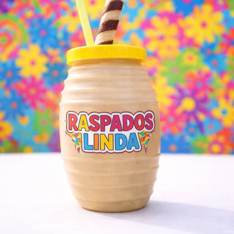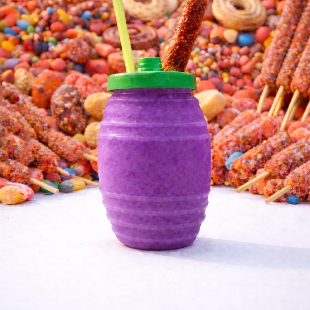 Escarchado completamente por dentro del vitrolero sabor picafresa, jarabe sabor uva, banderilla de tamarindo, chamoy, miguelito y