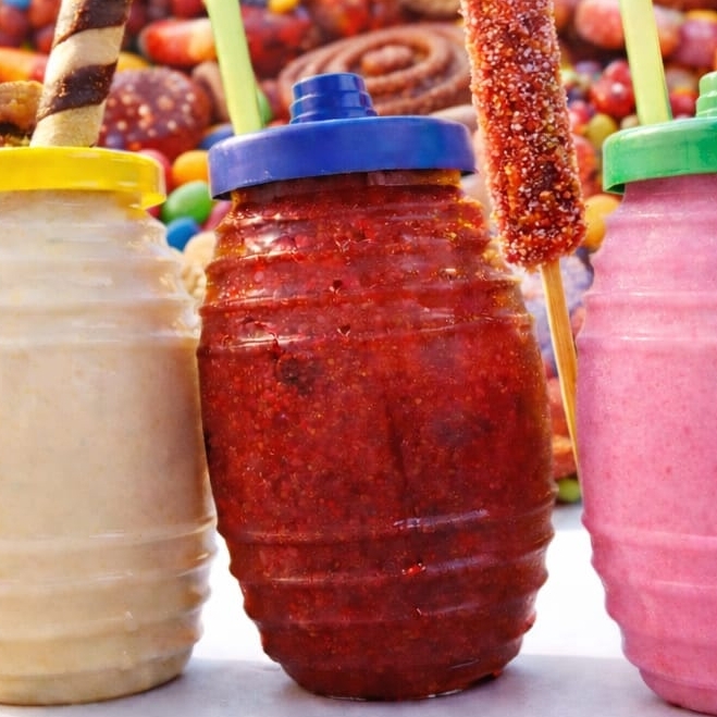 Escarchado por dentro del vitrolero sabor pica fresa,jarabe sabor mango,banderilla de tamarindo azucarado,chamoy, Miguelito,gomitas