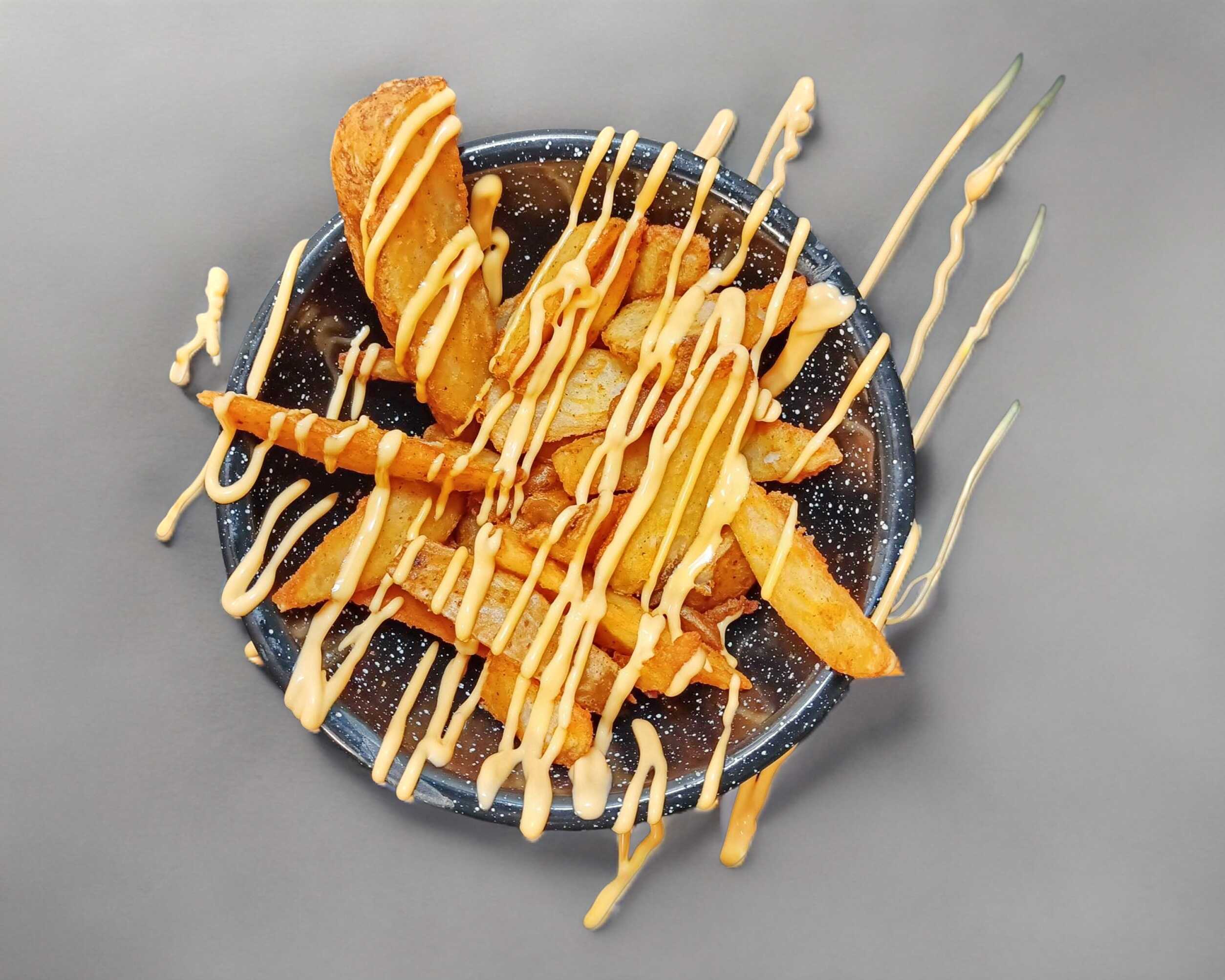 300 g De nuestras papas con mezcla especias mas 2 Onzas de queso cheddar más catsup.