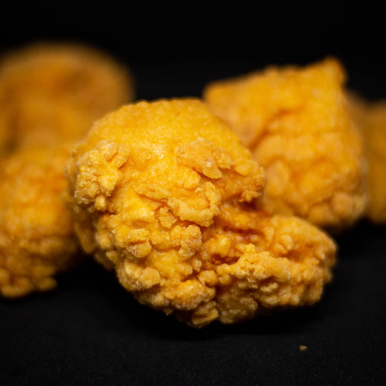 Trozos de pechuga empanizados, fritos y bañados en nuestras salsas acompañados de nuestros aderezos. 900 g 26 a 30 pzs aprox, hasta 3 salsas y 2 aderezos.