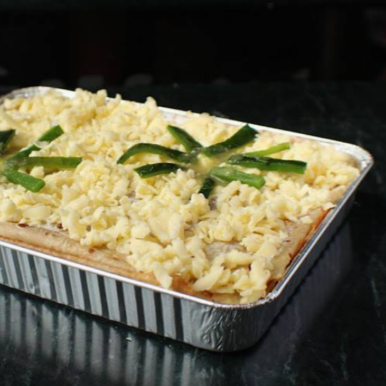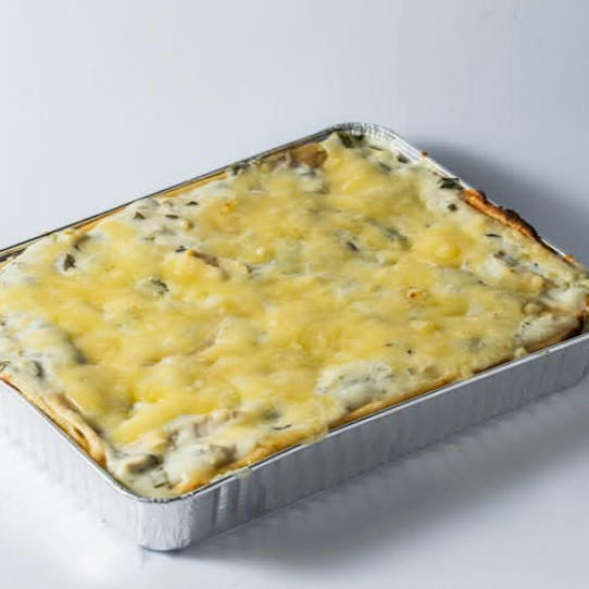 Pastel de crepas con pechuga de pollo, elotes, rajas, crema y queso (900 g). Elaborado en moldes para 4 personas.