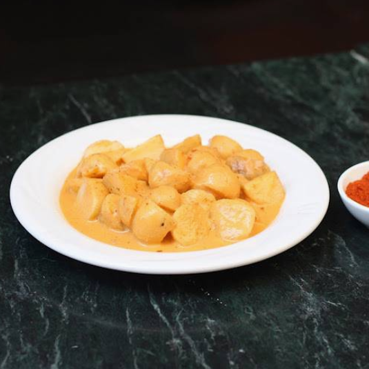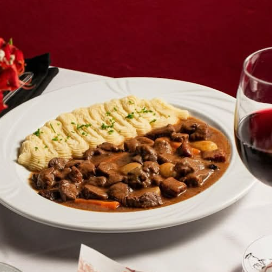 Corazón de filete en trozos de salsa de vino tinto, tocino, champiñones, cebollitas, zanahoria cambray y hierbas finas. Acompañado de puré de papas de la casa.