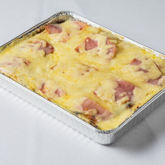 Pastel de crepas con jamón y queso gouda importado (900 g). Elaborado en moldes para 4 personas.