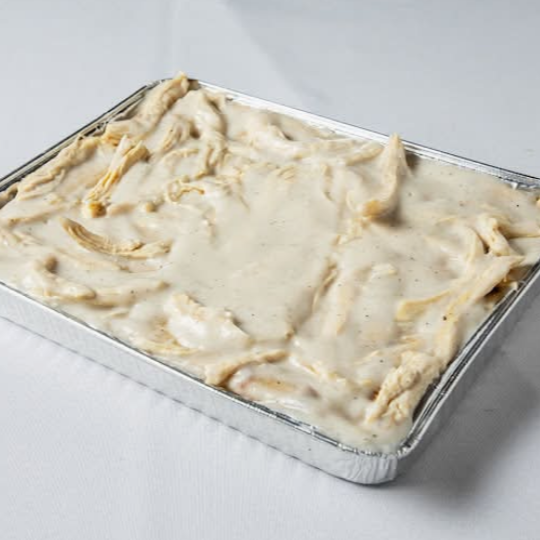 Con pechuga de pollo en salsa blanca.