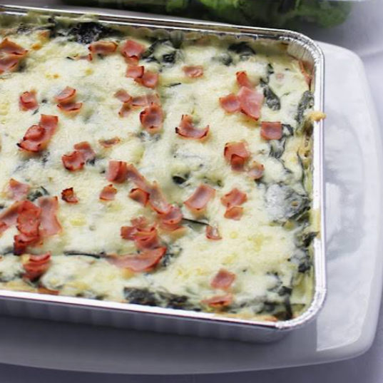Pastel de crepas de espinacas, queso, crema y jamón (900 g). Elaborado en moldes para 4 personas.