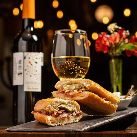 Baguette de prosciutto italiano, queso reblochón, jitomate seco, albahaca y corazón de alcachofa