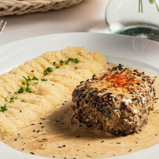 Corazón de filete en su jugo al sartén con pimienta verde, pimienta negra e hinojo y páprika en salsa de brandy y crema. Acompañado de papas gajo a la francesa.
