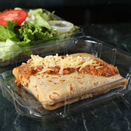Pastel de crepas con tradicional salsa de carne italiana (900 g). Elaborado en moldes para 4 personas.